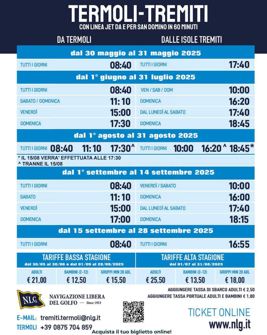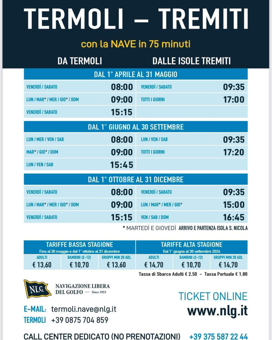 - Nave " SANTA LUCIA" (75 minuti) Il martedi e giovedi l'attracco è all'Isola San Nicola (NOTA BENE: selezionare TERMOLI-TREMITI S.D. NAVE PER SAN DOMINO).