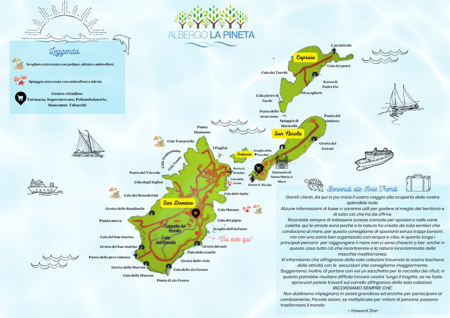 Indicazioni per chi vuole raggiungerci a piedi in circa 20 minuti dal porto: procedere per la salita di Via Federico II proseguire a sinistra per Via A. Vespucci e arrivati in piazzetta S. Pertini proseguire in Via A. Moro e al termine proseguire a sinistra seguendo i cartelli.